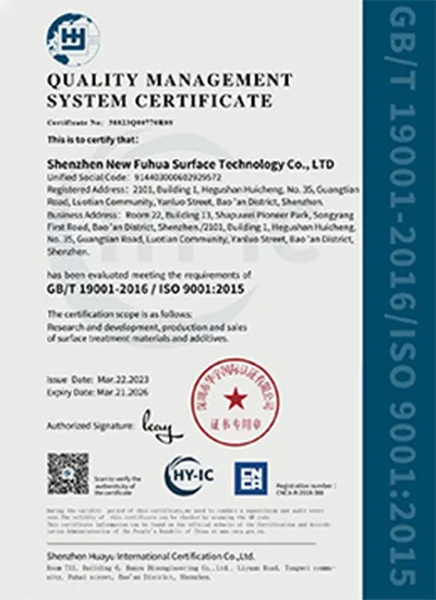 Shenzhen Xinfuhua Surface Technology Co., Ltd. was established in 2005. It is an electroplating additive technology enterprise specializing in the production, sales and scientific research of electroplating technical services. The company has gathered a group of high-quality professional and technical talents. We are engaged in an unwavering exploration and creation of various types of additives, introducing advanced technological achievements from the foreign electroplating additive industry. Constantly introduce high-quality products with outstanding performance. Advanced analytical and testing equipment is adopted, and the entire process strictly follows the ISO9001:2004 international quality management system. The implementation of full-process quality monitoring provides a reliable guarantee for the excellent performance of the products. Main production and sales: Electroplating additives, electroplating raw materials, electroplating brighteners, lead-free white copper-tin, long-lasting pearl nickel, brass tin brighteners, bright tin brighteners, matte tin additives, nickel rolling brighteners, tin-nickel gun brighteners, micro-cobalt gun brighteners, alkaline copper brighteners, coke copper brighteners, acid copper brighteners, trivalent chromium white chromium, trivalent chromium black chromium, acid gold additives, neutral gold brighteners, thick silver brighteners Chromium-substitute brightener...
